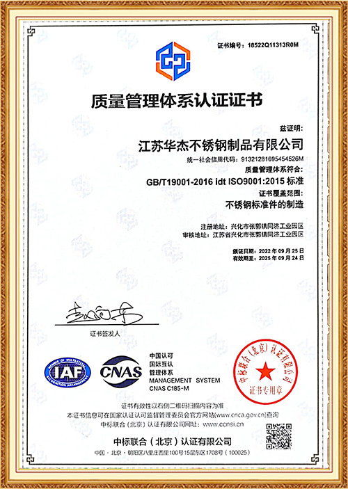 Sebagai pengeluar yang disahkan di bawah sistem pengurusan ISO 9001/14001/18001, Jiangsu Huajie memastikan setiap produk -dari pemilihan bahan mentah hingga pemeriksaan akhir -memaparkan piawaian kualiti tertinggi. Peralatan ujian lanjutan kami termasuk penguji tegangan, penguji kekerasan, ruang kakisan semburan garam, dan banyak lagi, membolehkan kami mengesahkan prestasi mekanikal dan alam sekitar.